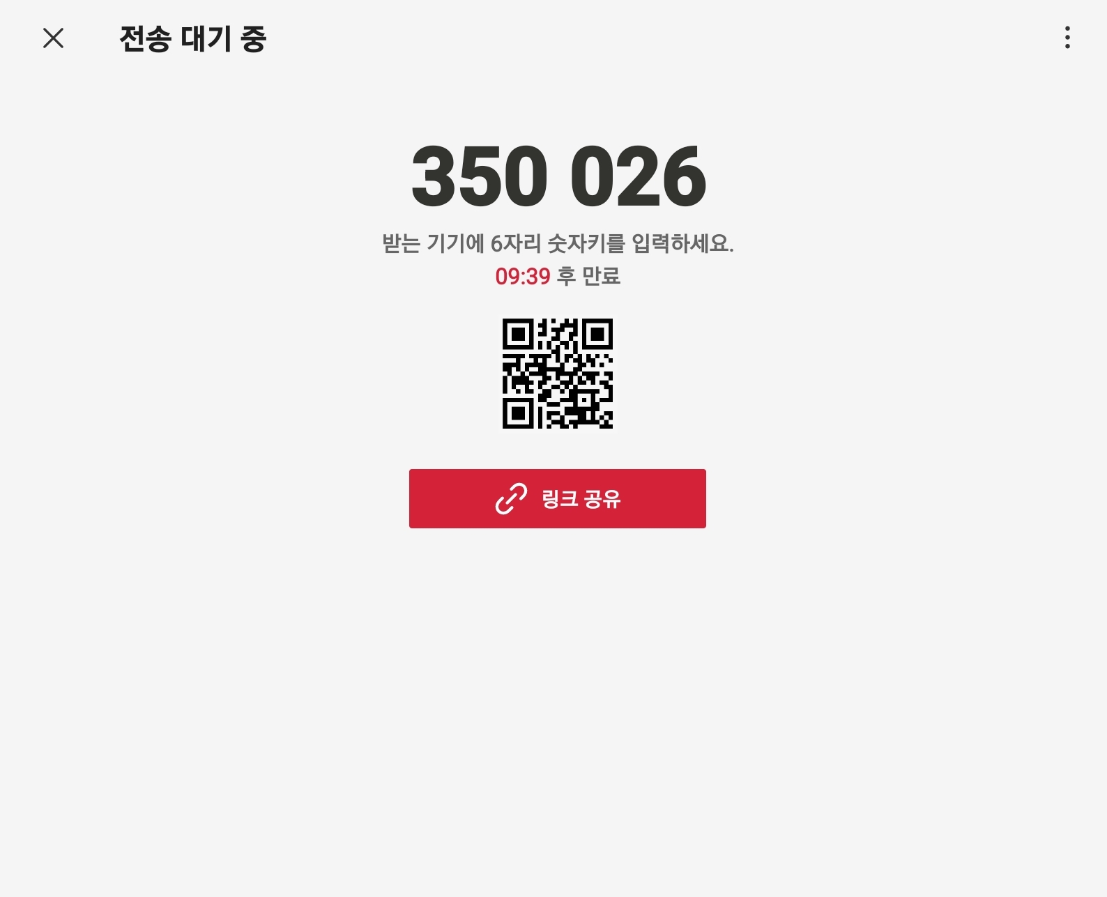 1:1 전송을 보내면 위에 같이 번호와 QR코드가 나온다. 전송받을 기기에서 6자리 숫자나 QR코드를 찍으면 전송이 가능합니다. 단, 10분 동안 숫자코드와 QR코드가 사용 가능하니 빨리 받아서 전송하는 것이 좋습니다.
