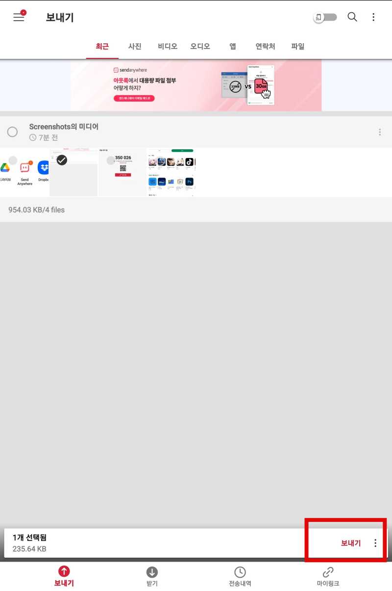 사용법은 PC버전과 거의 비슷하여 매우 간단합니다. 전송할 영상이나 사진을 선택하여 화면 하단에 뜨는 보내기 버튼을 클릭하면 전송할 수 있으며 받기 위해서는 PC버전과 마찬가지로 숫자코드와 QR코드를 사용하면 다운로드할 수 있습니다. 그리고 역시 똑같이 숫자코드와 QR코드가 10분간 사용가능하니 빠르게 처리하는 게 좋습니다.