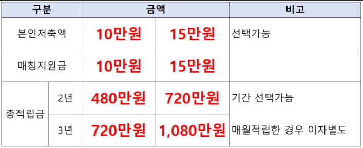 다만 적립할 수 있는 금액은 10만원과 15만원 둘 중에 하나만 선택할 수 있습니다. 적립기간 역시 2년 또는 3년 중 하나면 선택 가능합니다.