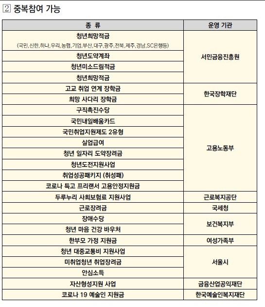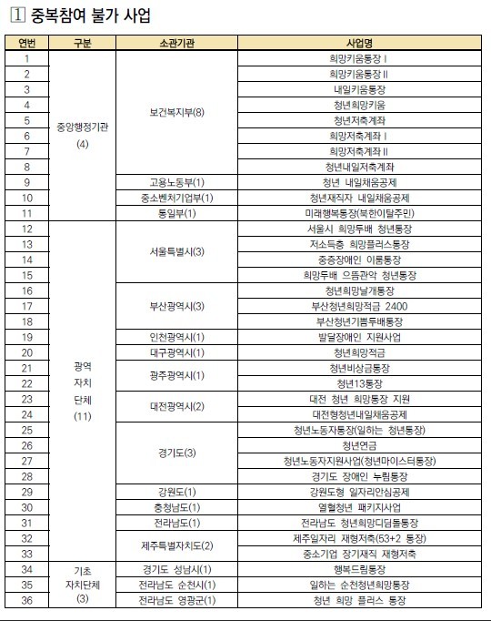 서울시에서는 중복 참여 가능한 사업과 불가능한 사업을 분류해 놨습니다. 대표적으로 청년저축계좌, 희망저축계좌, 내일체움공제 등의 경우 희망두배 청년통장과 중복해서 가입이 안됩니다.