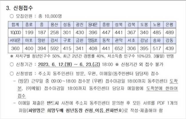 희망두배 청년통장 신청방법은 주소지 동주민센터 방문과 우편 그리고 이메일 접수 3가지가 있습니다. 온라인으로 신청할 수없습니다. 방문신청은 근무일 중 9시부터 18시 사이에 방문하여 신청하면 됩니다. 우편과 이메일은 접수마감일 18시까지 동주민센터 또는 담당자 메일함에 신청서류를 제출하면 됩니다.