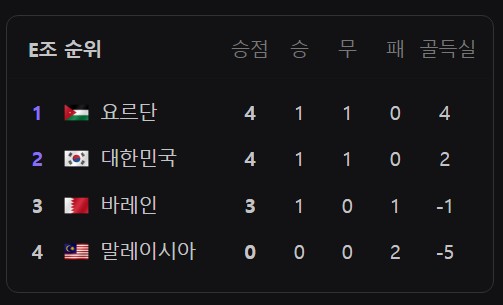 현재 한국은 1승 1무로 E조 2위이다. 요르단에 골득실차로 인해 2위로 밀린 한국은 예선 3라운드에서 요르단이 바레인에 승리한다면 2골차가 나는 골득실을 뒤집기 위해 다득점 승리가 필요하다. 예를 들어 요르단이 바레인을 한골차 승리를 한다면 4골차 이상의 승리가 필요한 상황이다. 한국이 1위가 된다면 D조 2위가 유력한 일본이 상대가 되어 16강 대진은 한일전이 된다. 그리고 한국이 2위로 16강을 진출한다면 F조 1위와 16강을 하게 되는데 사우디아라비아가 유력한 상황이지만 태국도 될수 있다. 최악의 경우 한국 말레이사아와 무승부를 기록해 조 3위가 될 경우 개최국인 카타르나 이라크와 16강전을 하게 된다. 어떤 결과가 나올지는 아무도 모르기에 25일 말레이시아와의 조별예선 마지막 라운드를 관심있게 지켜봐야 할거 같다.